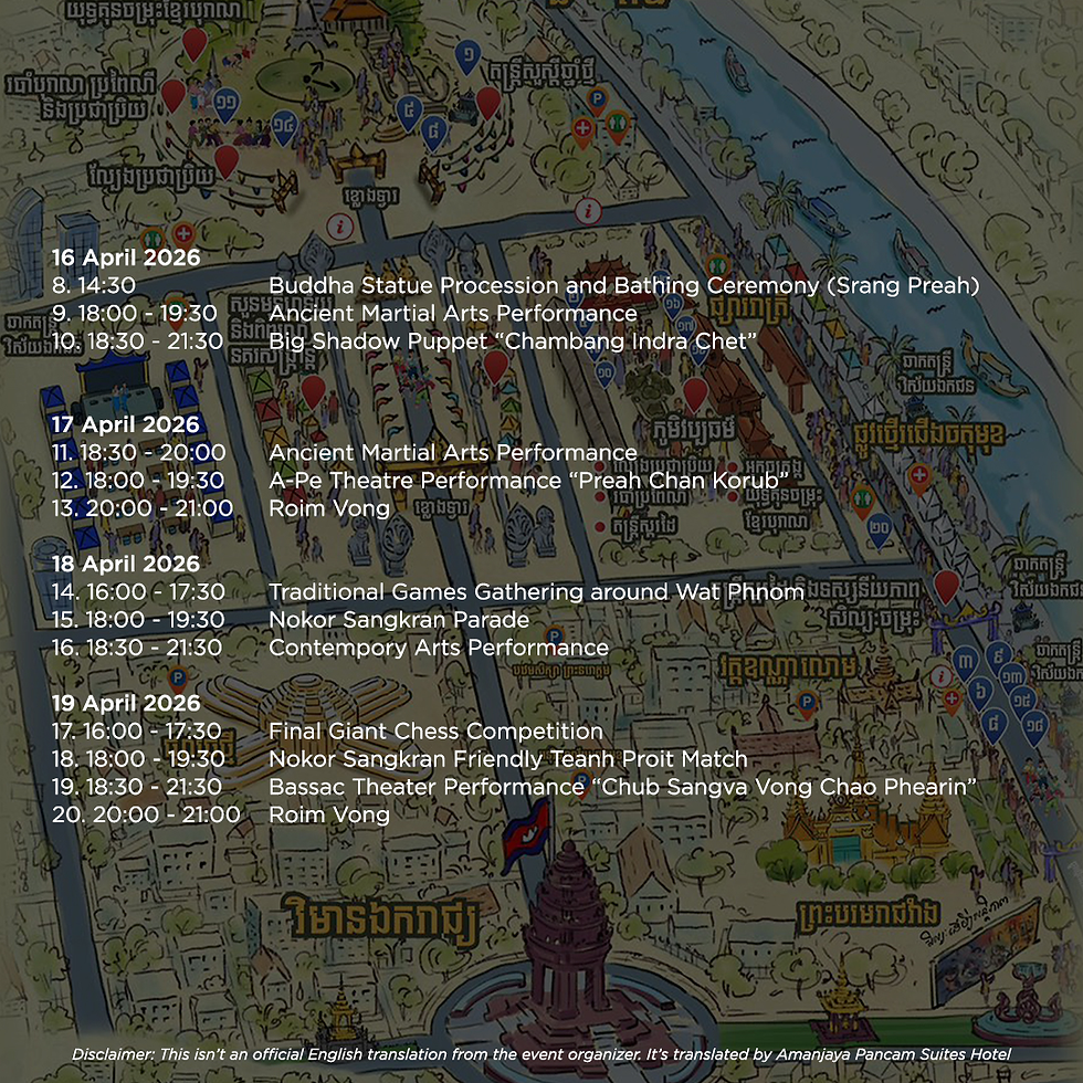 📍 À Siem Reap : Le "Siem Reap Sankranta 2026" promet une édition exceptionnelle étalée sur quatre jours, du 13 au 16 avril ! Les festivités s'organiseront autour de grandes zones d'activités, des rives du fleuve jusqu'à Pub Street. Au programme : des courses de bateaux et des balades sur l'eau, de vastes espaces d'expositions gastronomiques, des jeux folkloriques khmers, des concerts de percussions traditionnelles, sans oublier le rituel sacré du bain des statues de Bouddha (Pithi Srang Preah).